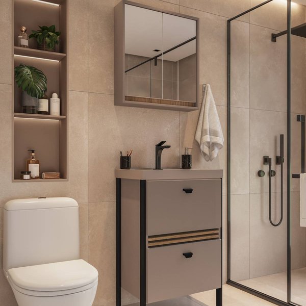 Garanta elegância e praticidade no seu banheiro com o Gabinete de Banheiro com Pia e Armário Ref. 660 da Cewal , uma solução completa com design moderno, materiais de qualidade e acabamento exclusivo.